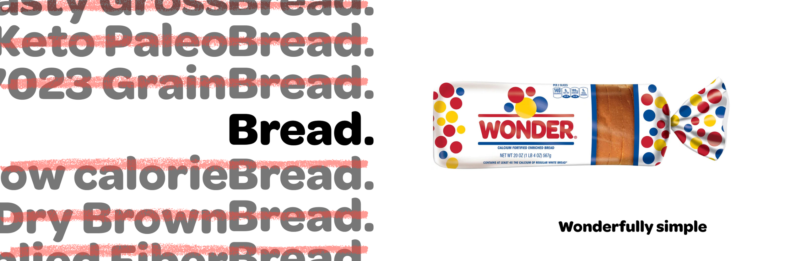 Wonder Bread stirs the imagination, encouraging you to give in to your truest cravings and enjoy the pure, familiar taste of an American classic. Wonderbread offers emotional nourishment and everyday goodness.